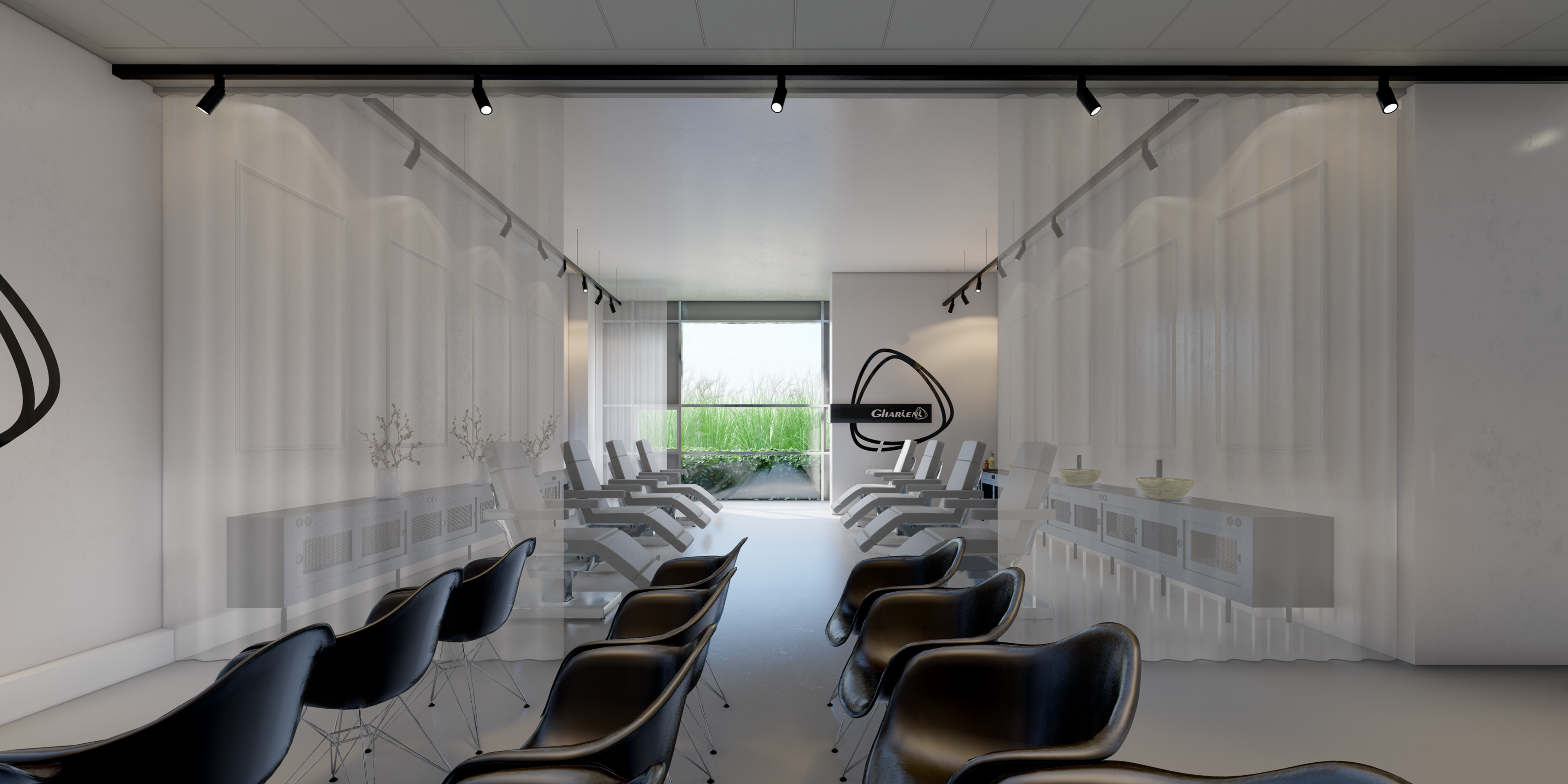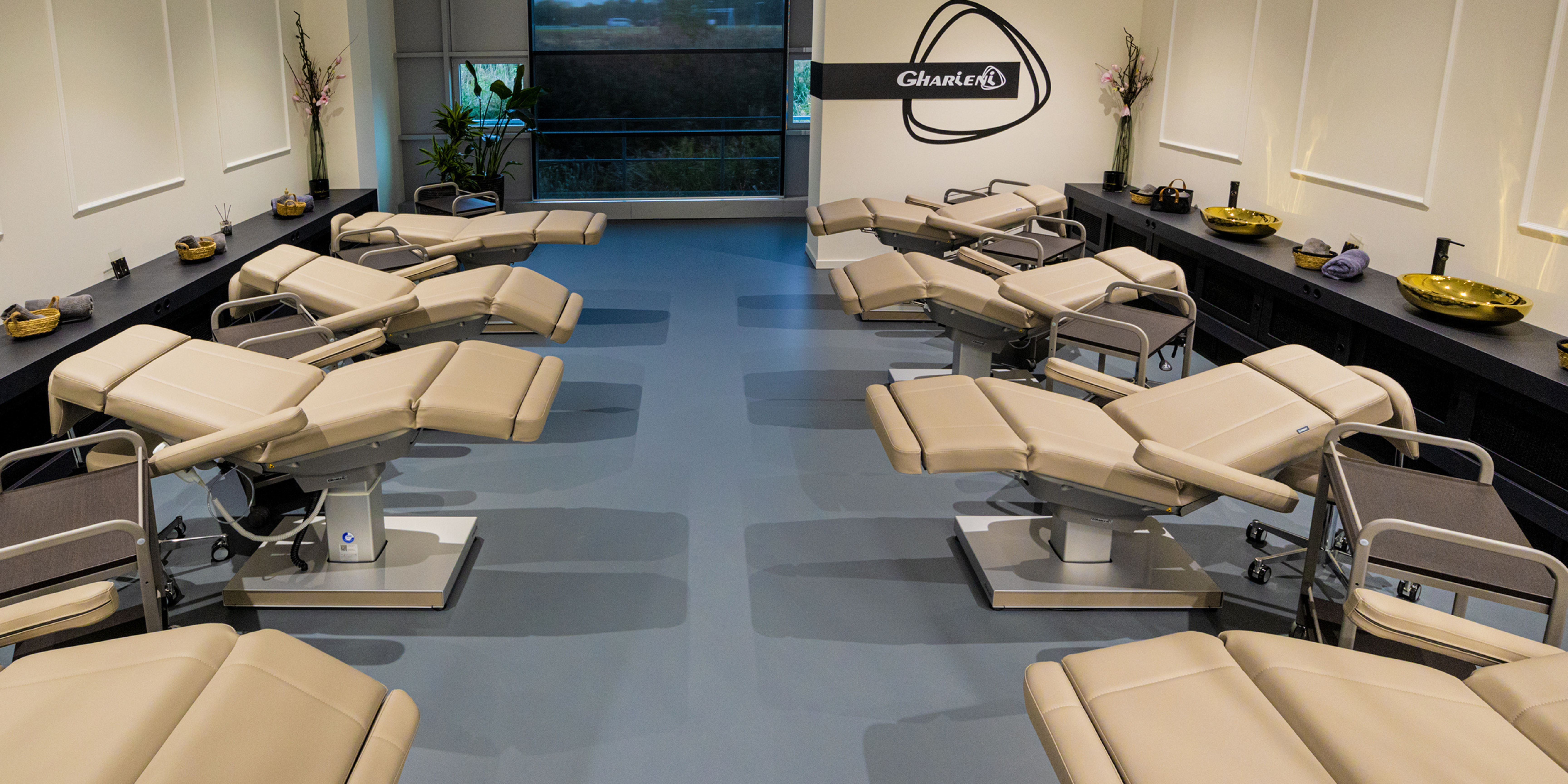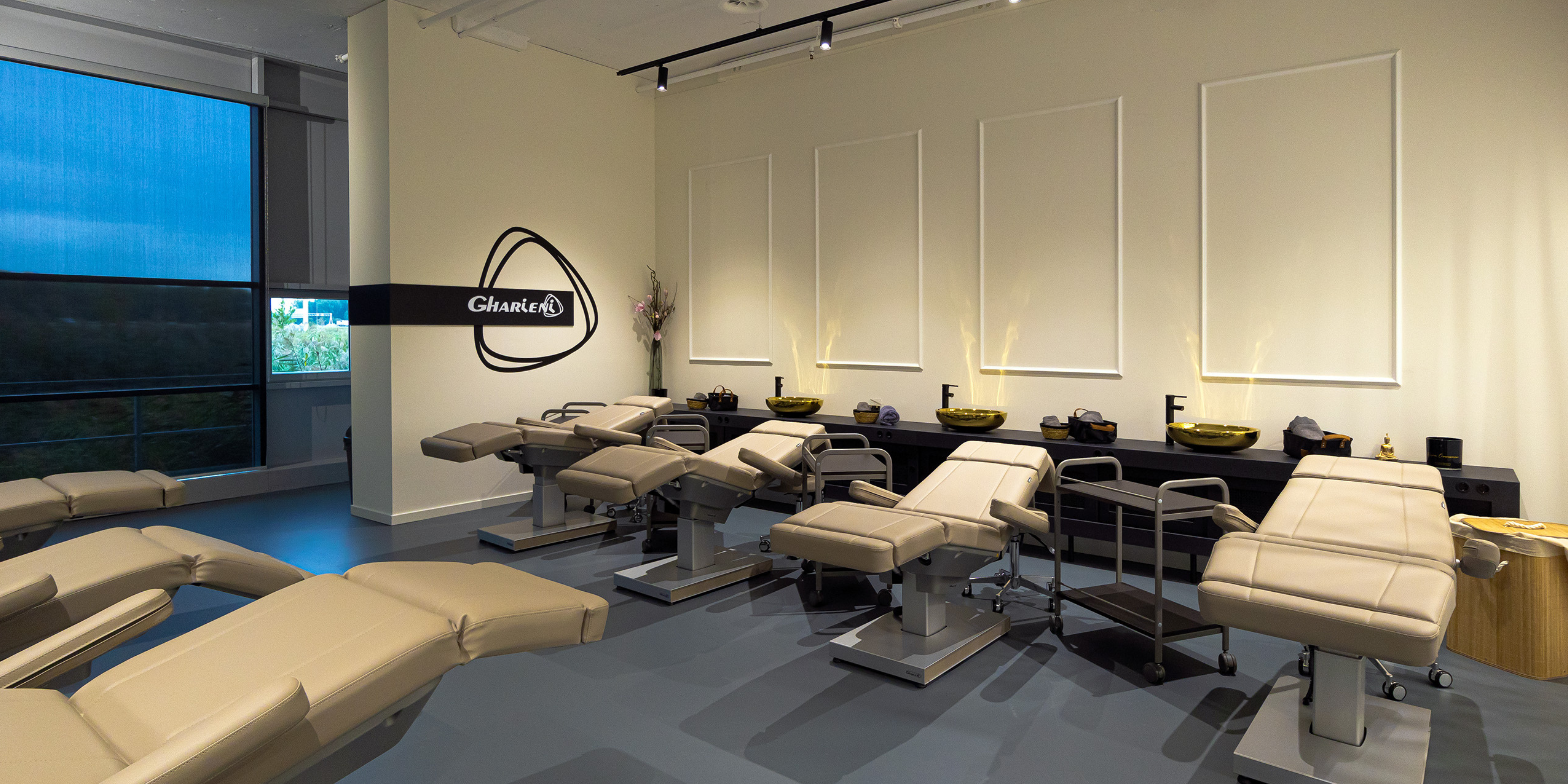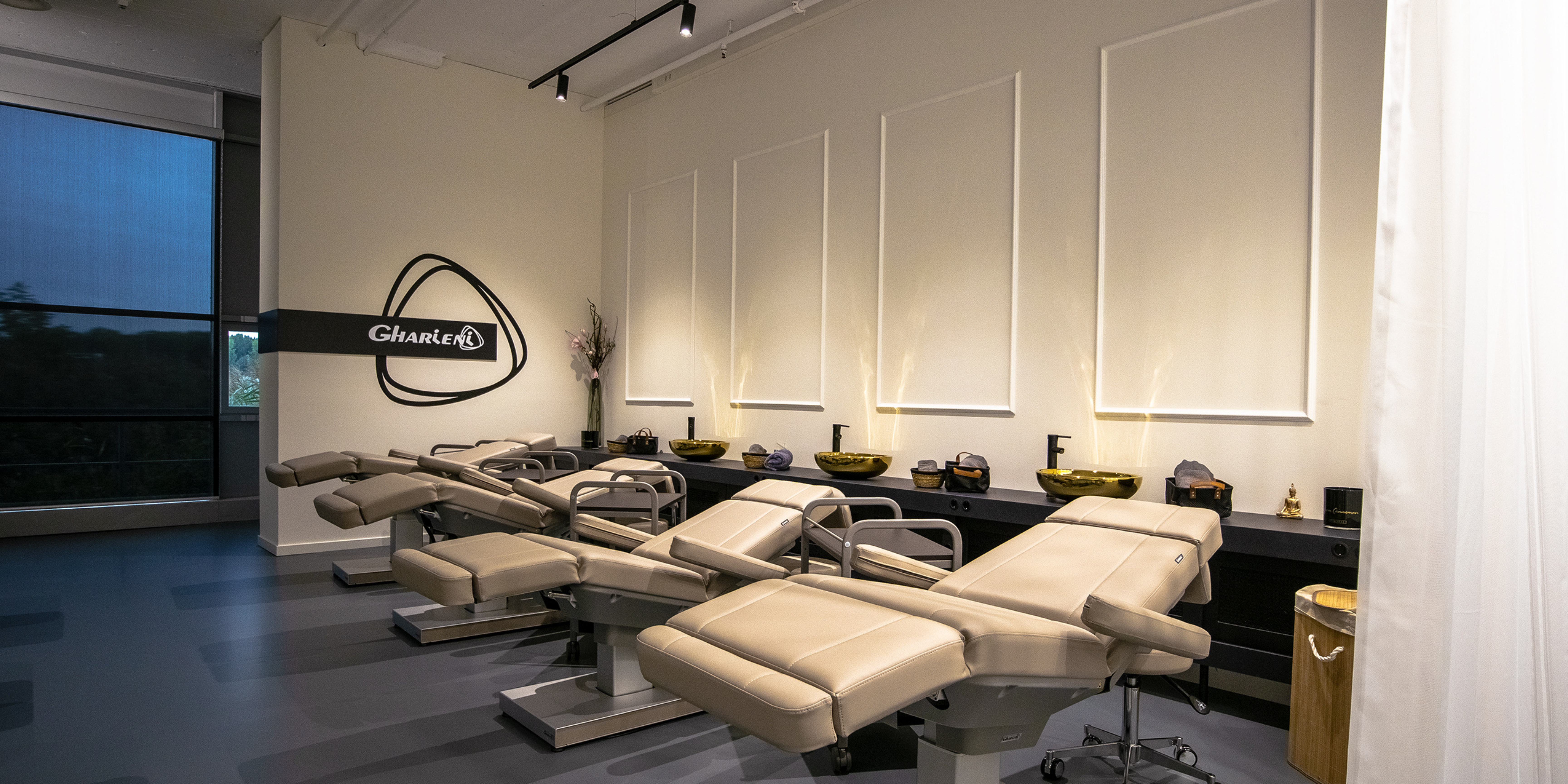 Het Training Center by Gharieni is volledig ingericht als praktijk- en theorie ruimte met behandelstoelen, wasbakken, stoelen, krukken, handdoeken, WIFI, werkruimte en meer.